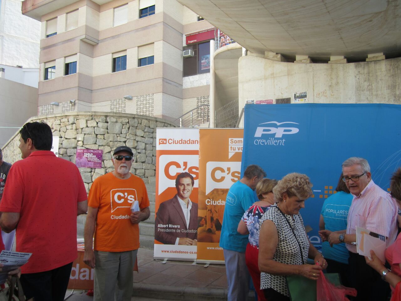 Durante la mesa informativa de la mañana, cuando los integrantes de la agrupación local del Partido Popular instalaron su mesa junto a la de Ciudadanos, taparon y ocultaron, con su están trasero, los carteles del partido de los ciudadanos, no atendiendo las quejas de los miembros de Ciudadanos Crevillent, que solicitaban que dicha acción fuese corregida”.