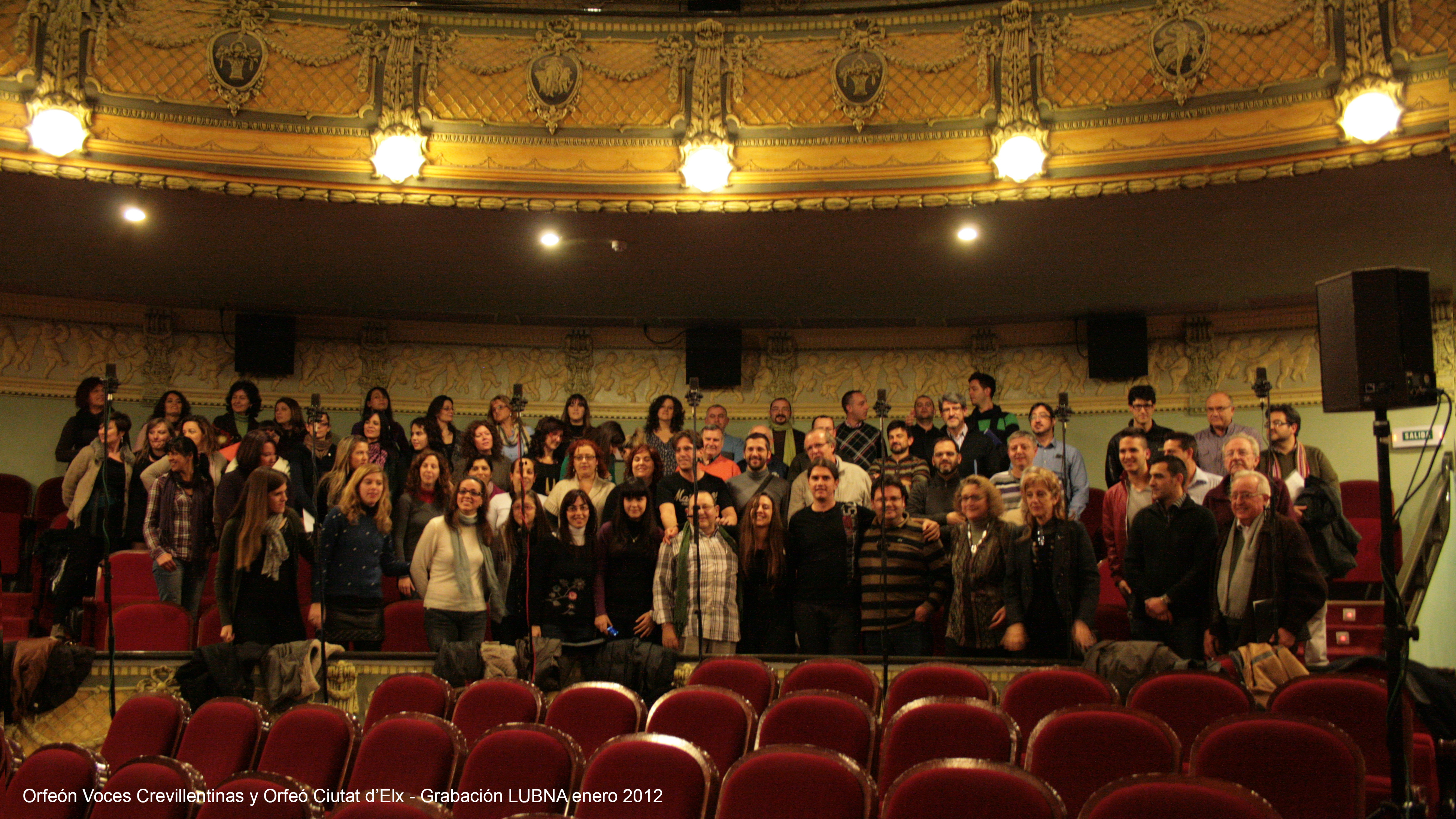 La parte coral, que tiene un gran peso en la obra, puesto que interviene en 14 de las 17 piezas de LUBNA, fue grabada por el Orfeón Voces Crevillentinas y el Orfeó Ciutat d’Elx en el Gran Teatro de Elche, en enero de 2012, bajo la Dirección de Pepe Herrero y supervisión de la Diva Catalana. Según nos informa Paco Martínez, Presidente del Orfeón Voces Crevillentinas, fueron cinco sesiones intensas que compartieron con la estrella de la música, que día a día fue supervisando y perfilando la obra pieza por pieza, junto con un magnífico equipo profesional y humano.