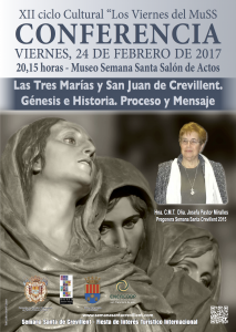 ”Las Tres Marías y San Juan de Crevillent. Génesis e Historia. Proceso y Mensaje”, es el título de la conferencia que este viernes 24 de febrero, imparte la Hermana Josefa Pastor Miralles, en el Museo de Semana Santa. La Cofradía de las Tres Marías y San Juan, es la encargada este año del Encendido de la Cruz de la Cuaresma.