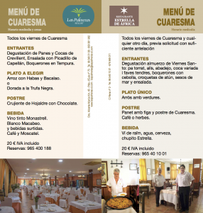 Con el deseo de mantener y al mismo tiempo promocionar la gastronomía cuaresmal propia de este tiempo litúrgico, la Federación de Cofradías y Hermandades de Semana Santa, ha organizado las VII Jornadas Gastronómicas Cuaresmales “Villa de Crevillent”, en las que han confirmado su participación los Restaurantes “Las Palmeras” y “Estrella de África”.