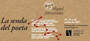 Crevillent (10/03/2017).- Crevillent vuelve a ser uno de los destinos por los que transcurrirá “La Senda del poeta”. Está previsto que la expedición llegué al área recreativa de la Estación el día 25 de marzo a las 13.30 horas. Esta actividad está organiza por el Institut Valencià de la Joventut (IVAJ) en colaboración con los ayuntamientos por donde pasa esta senda. Además, este año cobra especial importancia la figura del poeta Miguel Hernández, al conmemorarse el 75 aniversario de su fallecimiento, la actividad tendrá lugar los días 24, 25 y 26 de marzo de 2017.
