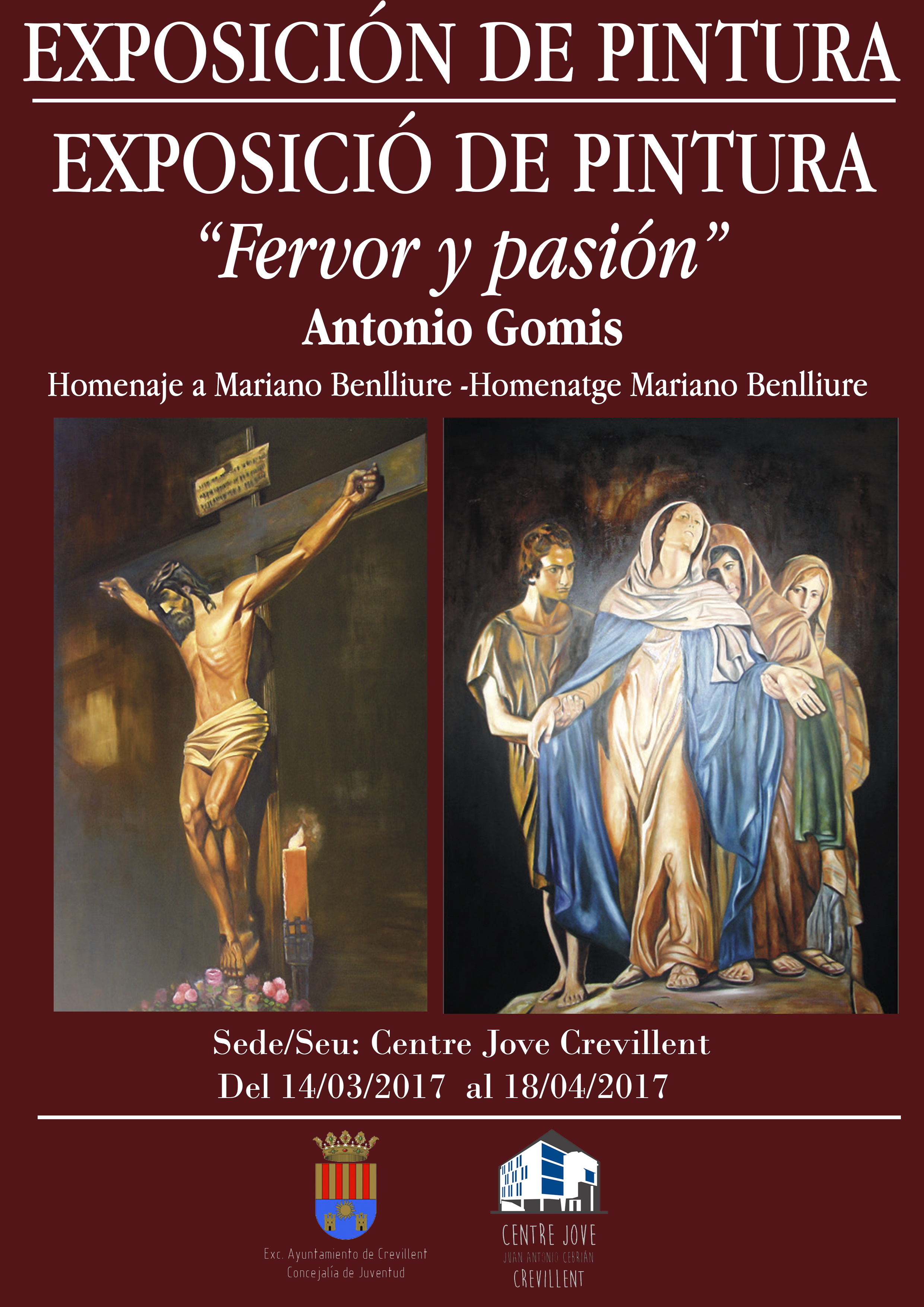 Crevillent (14/03/2017).- El Centre Jove “Juan Antonio Cebrián” acoge este martes la exposición de pinturas de Semana Santa «Fervor y Pasión» realizada por Antonio Gomis. Con esta muestra el artista crevillentino quiere rendir un homenaje a la figura del insigne escultor, Mariano Benlliure.