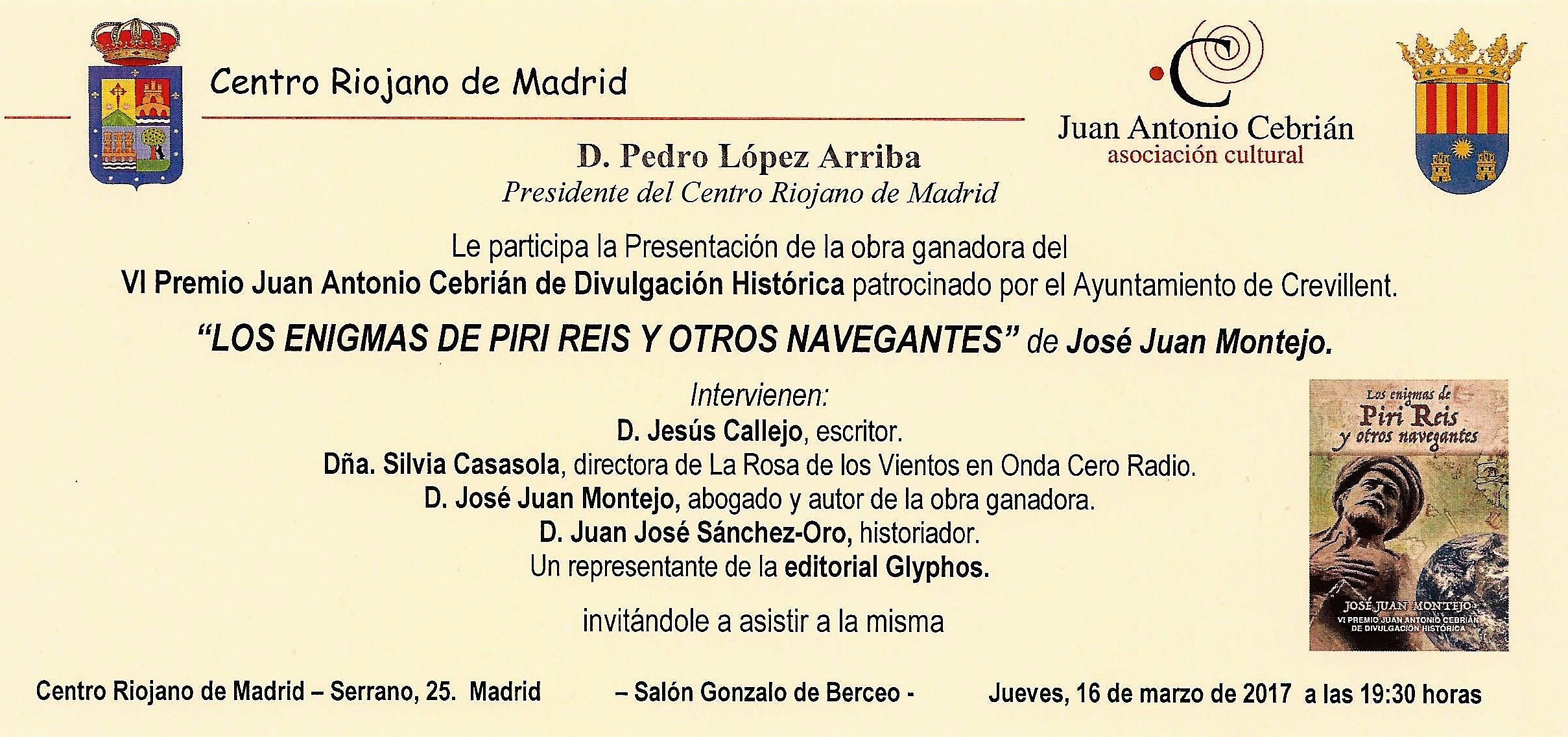 El acto tendrá lugar en el Centro Riojano, sito en la calle Serrano. Además de su autor, el abogado criminalista Juan José Montejo, asistirán la directora del programa de radio “La rosa de los vientos” y presidenta de la Asociación Cultural “Juan Antonio Cebrián”, Silvia Casasola, el historiador Juan José Sánchez Oro, el periodista y escritor Jesús Callejo, un representante de la editorial Glyphos y el Presidente del Centro Riojano en Madrid, Pedro López Arriba.