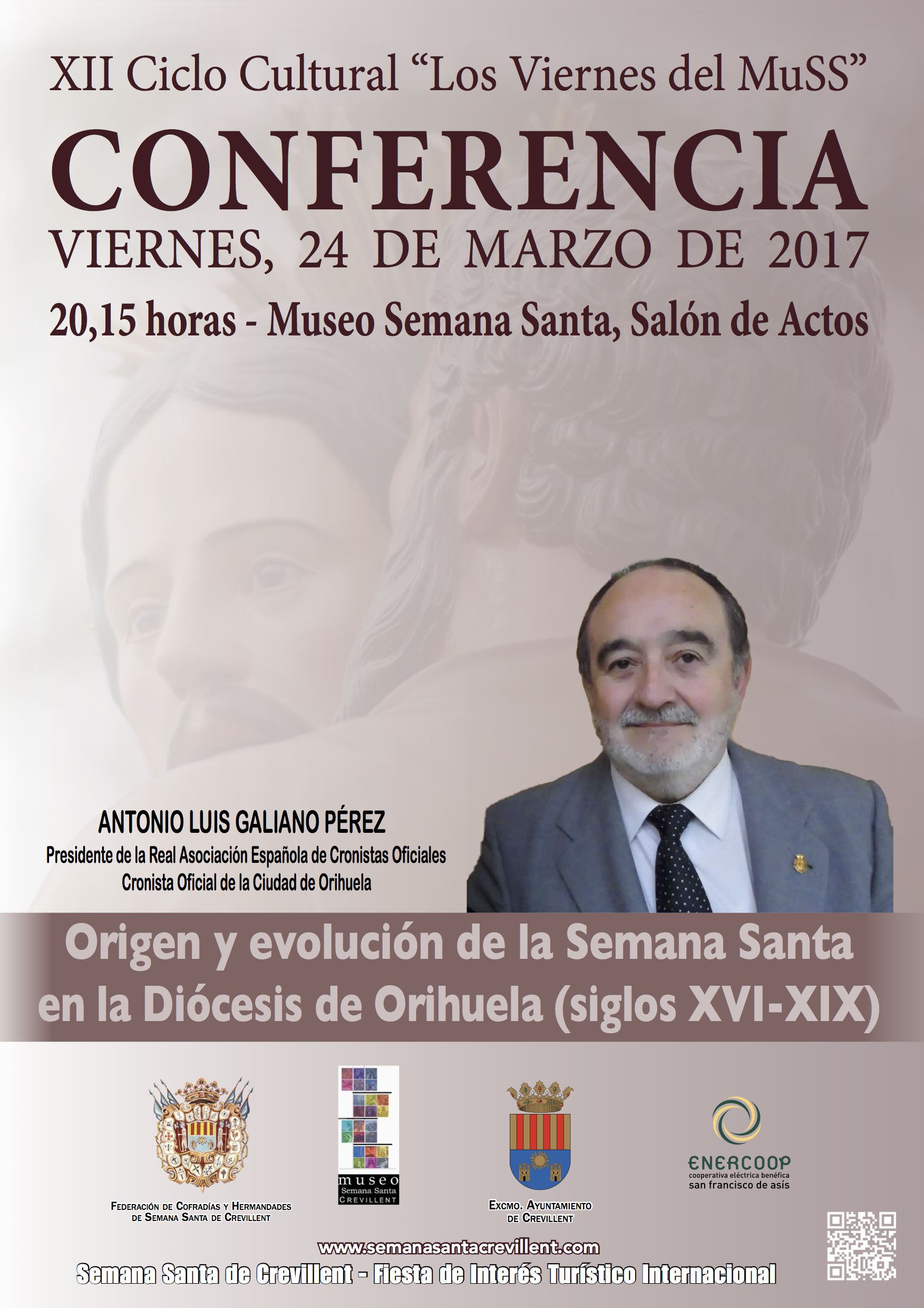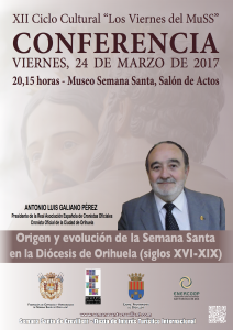 “Origen y evolución de la Semana Santa en la Diócesis de Orihuela (siglos XVI-XIX)”, es la título de la conferencia que este viernes día veinticuatro de marzo, a las ocho y cuarto de la tarde, presenta el XI Ciclo Cultural “Los viernes del MUSS”.