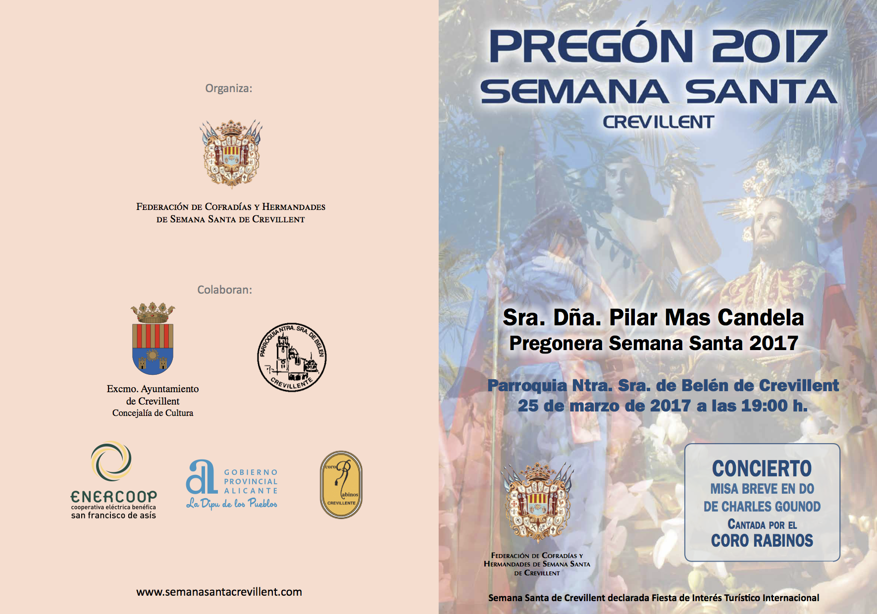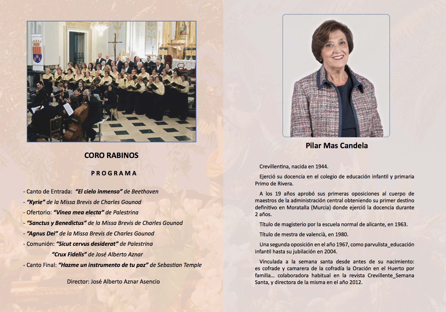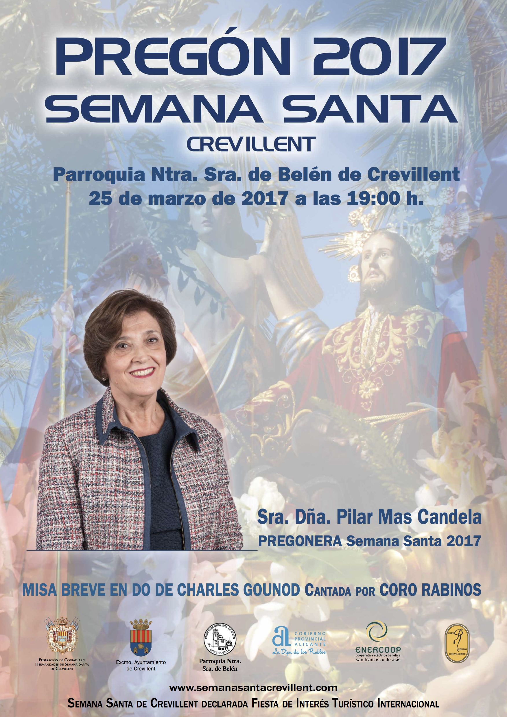 Todo está dispuesto para que este sábado, la crevillentina, Pilar Mas Candela, proclame desde el ambón de la Parroquia de Nuestra Señora de Belén, el Pregón de la ya inminente Semana Santa.