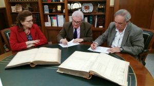 Crevillent (23/03/2017).- El Alcalde de Crevillent, en representación del Ayuntamiento acompañado por la Concejal de Cultura Loreto Mallol, ha firmado junto al Presidente del Coro Ruiz Gasch, Enrique Ruiz Alfonso, la donación de dos libros de principios del siglo XX de la fábrica crevillentina “Don Recaredo” dedicada a la industria del textil.
