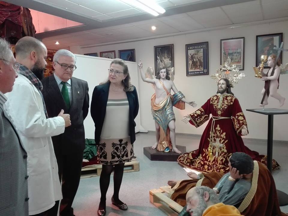 Crevillent (06/04/2017).- El Alcalde, César Augusto Asencio, la concejal de Cultura, Loreto Mallol, el Presidente de la Federación de Cofradías y Hermandades de Semana Santa, José Antonio Maciá, y varios representantes de las cofradías, han visitado el Museo de Semana Santa para comprobar los segundos trabajos de restauración de las imágenes que se procesionan en la Semana Santa de la localidad.