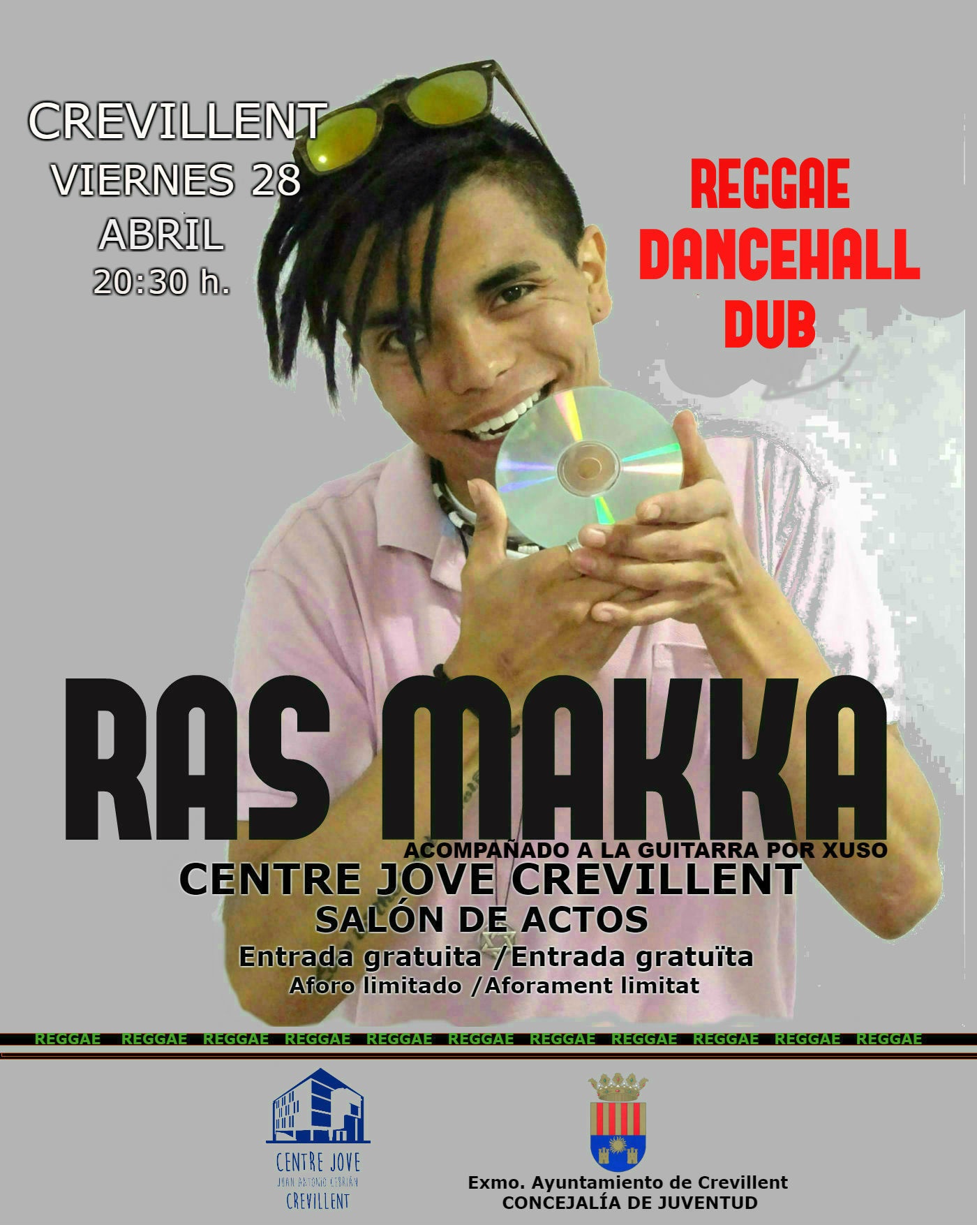 Por lo tanto, todos los amantes del reggae tienen una cita este viernes con la actuación de Ras Makka, programada por la Concejalía de Juventud del Ayuntamiento de Crevillent y el Centre Jove. Las entradas se deberán solicitar en recepción y se entregarán hasta agotar aforo.