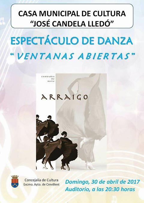 Crevillent (27/04/2017).- La Concejalía de Cultura ha organizado un espectáculo de danza para este domingo 30 de abril, a las 20.30 horas, en el Auditorio de la Casa Municipal de Cultura “José Candela Lledó”, a cargo de la compañía eldense de ballet “Arraigo”