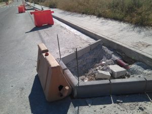 L’obra de remodelació d’aquest carrer s’està realitzant sense aplicar les mesures bàsiques de seguretat, sense fitar degudament els espais en obres , per a evitar el perill, per exemple, a més d’altres elements hi ha varetes metàl·liques d’uns 50 cm. d’altura al costat de les voreres.
