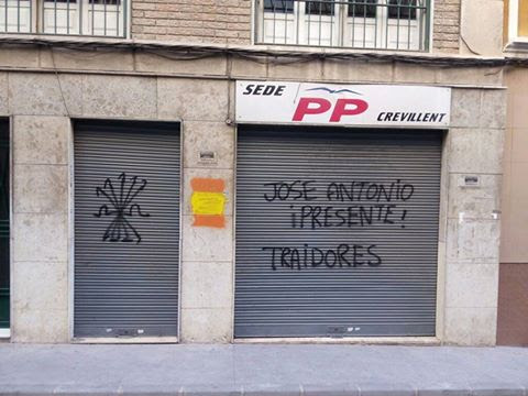 Desde Compromís per Crevillent, manifestamos nuestra absoluta condena y reprobación contra quienes han realizado las pintadas contra la sede del PP en Crevillent, pintadas que reflejan cual es el talante democrático de quienes la realizan.