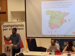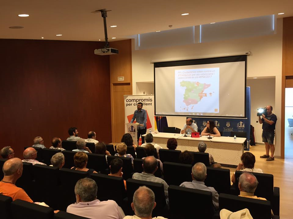 En dicha asamblea, con el salón del Centre Jove lleno de vecinos, se realizaron 3 intervenciones por parte de representantes políticos. En las que intervinieron en primer lugar Ignasi Candela, Diputado de Compromís por Alicante en el Congreso. Ignasi Candela habló sobre los Presupuestos Generales del Estado, destacando la propuesta de Compromís de reforma del sector eléctrico, la cual afecta directamente a Crevillent y que fue tumbada por el PP y Ciudadanos. Con esta enmienda que se presentó a los presupuestos se pretendía cambiar las condiciones para los pequeños productores de energías fotovoltaicas, y también explico la discriminación a los valencianos en los Presupuestos Generales del Estado, que además son profundamente antisociales.