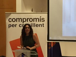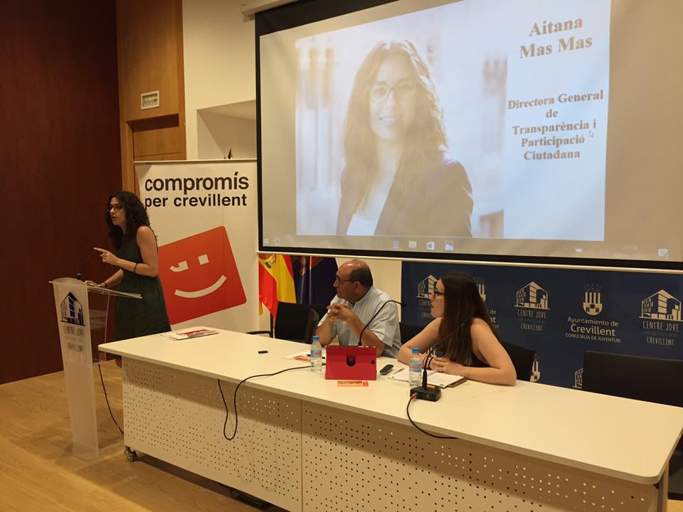 La segona intervenció va ser a càrrec d’Aitana Mas, Directora General de Transparència i de Participació Ciutadana. Com a membre del Govern de la Generalitat, va explicar la situació amb la qual es van trobar els actuals membres del Consell, davant l’espoli que s’havia realitzat per part del Partit Popular en el Govern de la Generalitat, amb una situació de total descontrol i falta d’organització, Aitana Mes també va explicar que a poc a poc s’estan reparant totes les males actuacions que es van realitzar per part de l’anterior govern, s’està invertint en més d’un 60% en polítiques socials, educació i sanitat, malgrat l’endeutament, i la falta de finançament per part del Govern central, sent la primera comunitat autònoma de tot l’Estat a aprovar els pressupostos, tenint un Govern de Coalició.