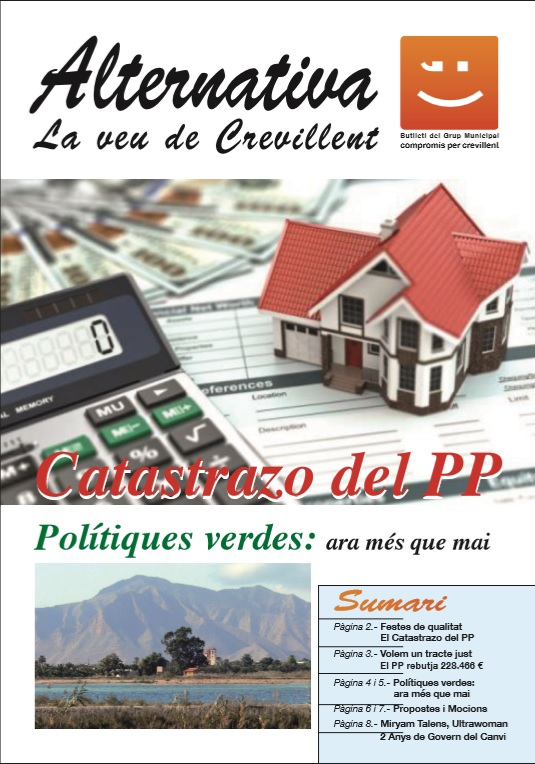 En este nuevo número de la revista podréis encontrar las diferentes actuaciones que ha realizado el Grupo de Compromís en los pasados meses, además del trabajo realizado en el Congreso de los Diputados respecto a los Presupuestos Generales del Estado. Además los temas centrales de dicha revista son el Catastrazo del PP que se ha producido con la revisión de los valores catastrales y también las políticas verdes de Compromís.