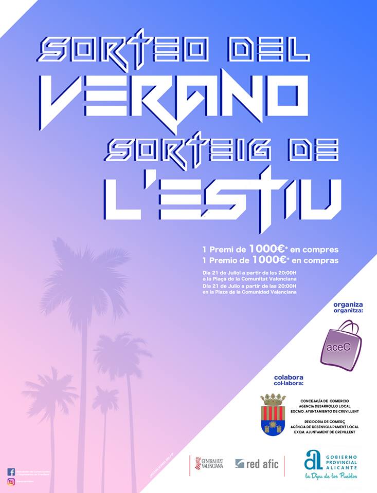 Crevillent ( 19/07/2017).- La Asociación de Comerciantes y Empresarios de Crevillent ha organizado para este viernes 21 de julio en la Plaza de la Comunidad Valenciana el “Sorteig d´Estiu”, que cuenta con el apoyo de las Concejalías de Comercio y Cultura .