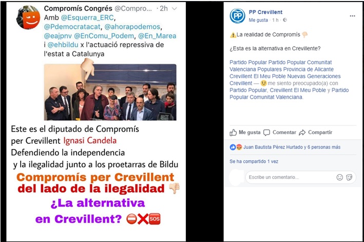 Compromís per Crevillent manifiesta su absoluta condena a la publicación que el PP de Crevillent, donde a través de la manipulación, se pretende asociar a este Grupo Político y en particular al Diputado crevillentino Ignasi Candela con los proetarras, la ilegalidad y la independencia.