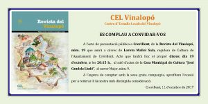 Crevillent ( 19/10/2017).- En el salón de actos de la Casa Municipal de Cultura “José Candela Lledó”, hoy jueves 19 de octubre a las 20,15h , se llevará a cabo la presentación de la Revista del Vinalopó, publicación anual de ciencias sociales de las comarcas del Vinalopó. La presentación correrá a cargo de la concejal de Cultura del Ayuntamiento de Crevillent, Loreto Mallol, interviniendo también el director y coordinador de la Revista Gabriel Segura Herrero.