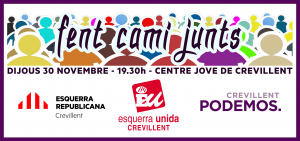 «Fent camí junts» és el títol de l’acte on intervindran Estefania Blanes (Guanyar Alcoi), Mikel Forcada i Víctor Domínguez (Guanyar Alacant) i Roberto Pilosio (Secretari general Podemos Callosa del Segura). És per això que convidem a tota la població crevillentina a què siga partícip d’este acte a les 19.30 h.