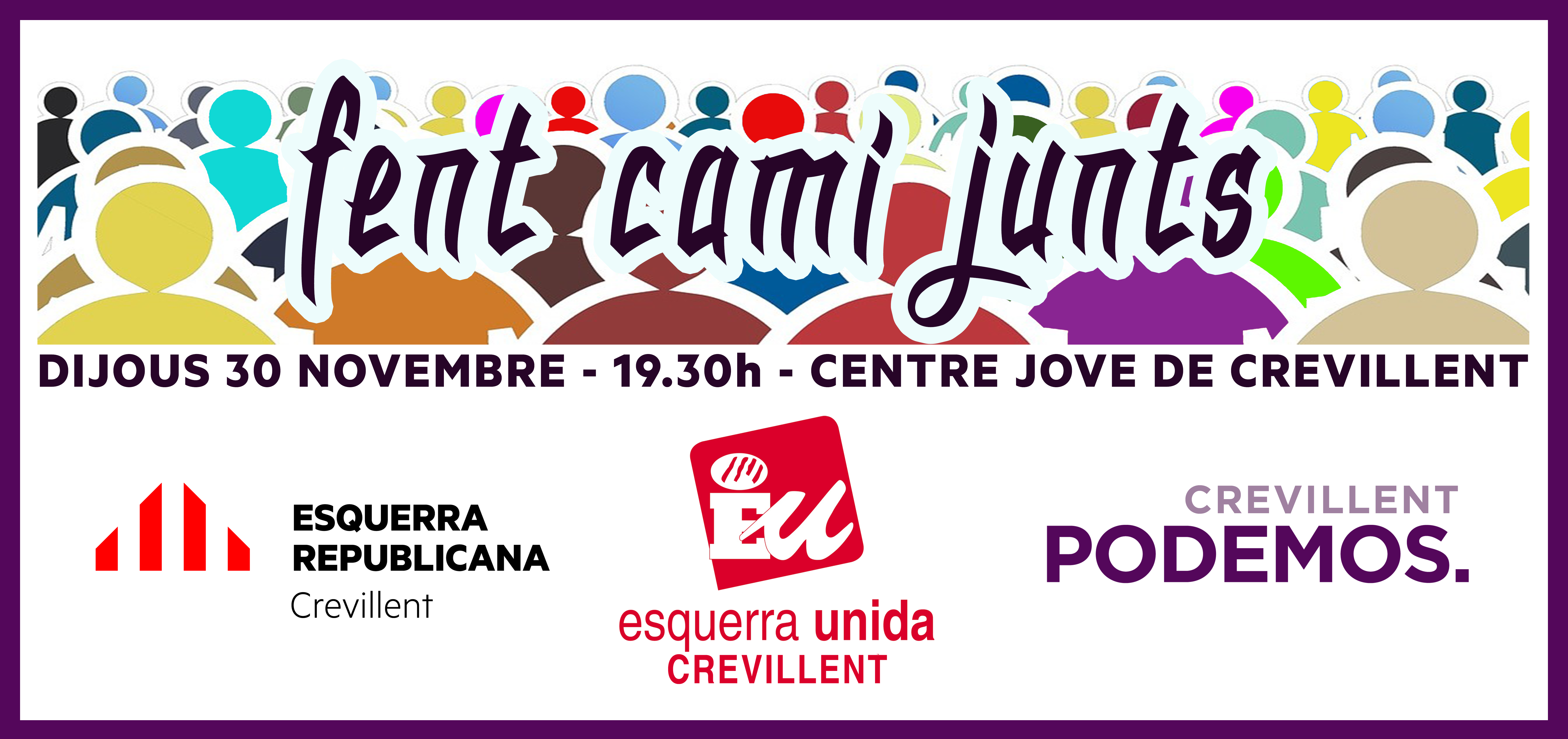 El dijous 30 de novembre, es realitzarà un acte en el saló de conferències del Centre Jove de Crevillent, on coneixerem el camí que han traçat organitzacions nostres en altres poblacions on s’organitzaren candidatures conjuntes mitjançant marques electorals. L’escenari polític local necessita ajuntar forces entre les formacions progressistes per desallotjar d’una vegada per totes a la dreta del consistori crevillentí i és per eixe mateix motiu que volem començar a caminar de manera coordinada.