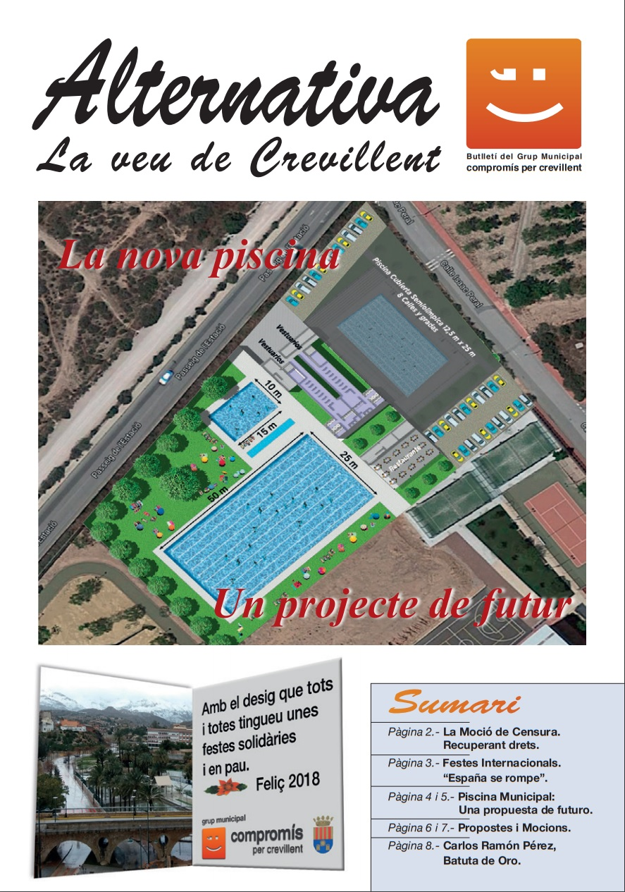 En este nuevo número de la revista podréis encontrar las diferentes actuaciones que ha realizado el Grupo de Compromís en los pasados meses, además del trabajo realizado por parte de la Conselleria de Mónica Óltra para impulsar la ley de dependencia. Los lectores también dispondrán de un artículo del Portavoz del Grupo Municipal de Compromís per Crevillent y Diputado Provincial, José Manuel Penalva, donde nos habla de la propuesta de Moción de Censura que presentó en el Pleno de noviembre. Además el tema central de dicha revista es la propuesta de Compromís para la ubicación de la Piscina Municipal de verano, un proyecto amplio con miras al futuro y que contemplará, en una segunda fase, también una piscina cubierta. Finalmente se realiza una entrevista al joven crevillentino Carlos Ramón Pérez, flamante ganador del premio internacional de la Batuta de Oro dentro del World Music Contest 2.017.