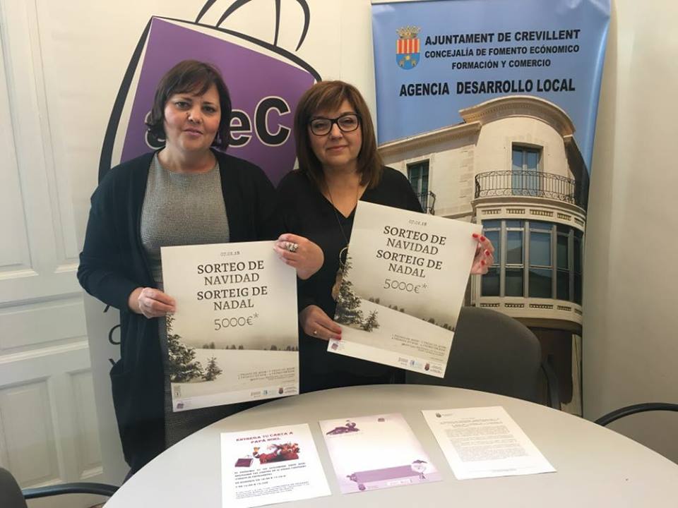 Crevillent ( 18/12/2017).- La Presidenta de la Asociación de Comerciantes Cristina Delicado y la concejal de Comercio Laura Gomis han presentado esta mañana en la Agencia de Desarrollo Local, el sorteo de Navidad que repartirá 5.000 € en premios. En la Casa Municipal de Cultura José Candela Lledó el domingo 7 de enero se realizará el Sorteo de Navidad . Esta actividad se enmarca dentro de la campaña de fomento de las compras en el comercio asociado que desarrollará durante estas navidades la Asociación de Comerciantes y Empresas de Crevillent , junto a la Concejalía de Comercio.