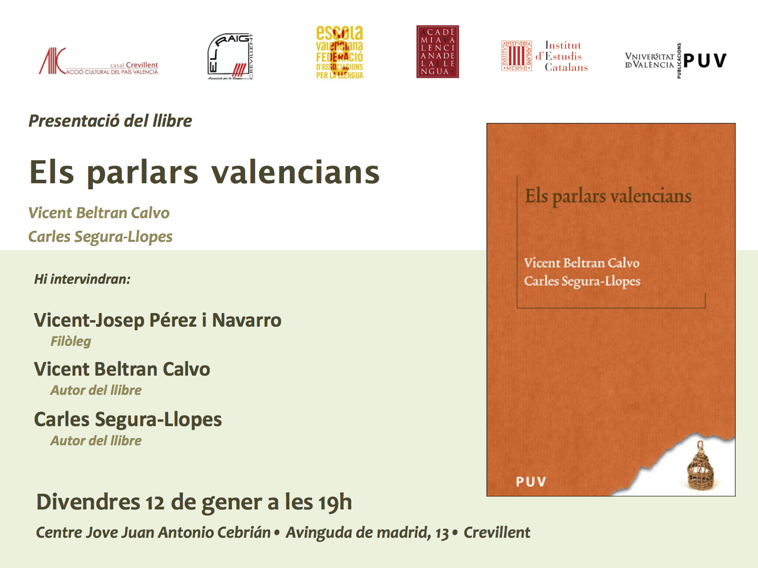Escola Valenciana – Associació per la Llengua “El Raig” de Crevillent i el Casal Jaume I-Acció Cultural del País Valencià han organitzat la presentació del llibre Els parlars valencians. El proper divendres 12 de gener de 2018, a les 19h en el Centre Jove Juan Antonio Cebrián de Crevillent. El llibre Els parlars valencians descriu la riquesa lingüística que presenta la llengua catalana al País Valencià a partir d’estudis i d’un meritori treball de camp amb enquestes dialectològiques a informants de més de 250 localitats de la geografia valenciana. Els treballs que han donat lloc a aquest llibre han estat mereixedors del Premi de l’Institut d’Estudis Catalans de Lexicografia i Onomàstica Joan Coromines 2017.