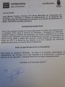 En enero de 2017 el Concejal de Basuras anunciaba que para verano de ese mismo año, se construirían unos “pipicanes” y un área canina en el municipio, como mejora incluida en la plica del servicio de limpieza viaria. Estamos en 2018 y los “pipicanes” y el área canina todavía no se han puesto en marcha.