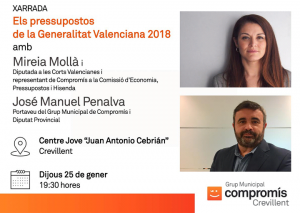 El Grupo Municipal de Compromís organiza este jueves día 25 de enero a las 19.30 h. en la sala de conferencias del Centre Jove “Juan Antonio Cebrián”una charla-coloquio referente a los Presupuestos de 2018 de la Generalitat Valenciana.