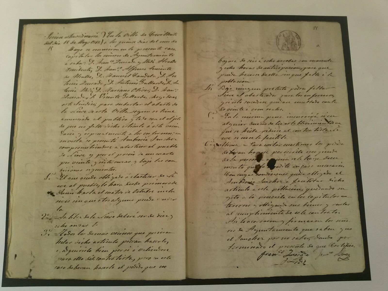 El documento, firmado por el entonces Alcalde Francisco Quesada y por el Teniente de Alcalde Francisco Alfonso, corresponde al Pleno celebrado el 15 de mayo de 1864, reunido de manera extraordinaria para “subastar el abasto de nieve de esta villa […], con objeto de que no falte dicho artículo a este vecindario y especialmente a los enfermos”