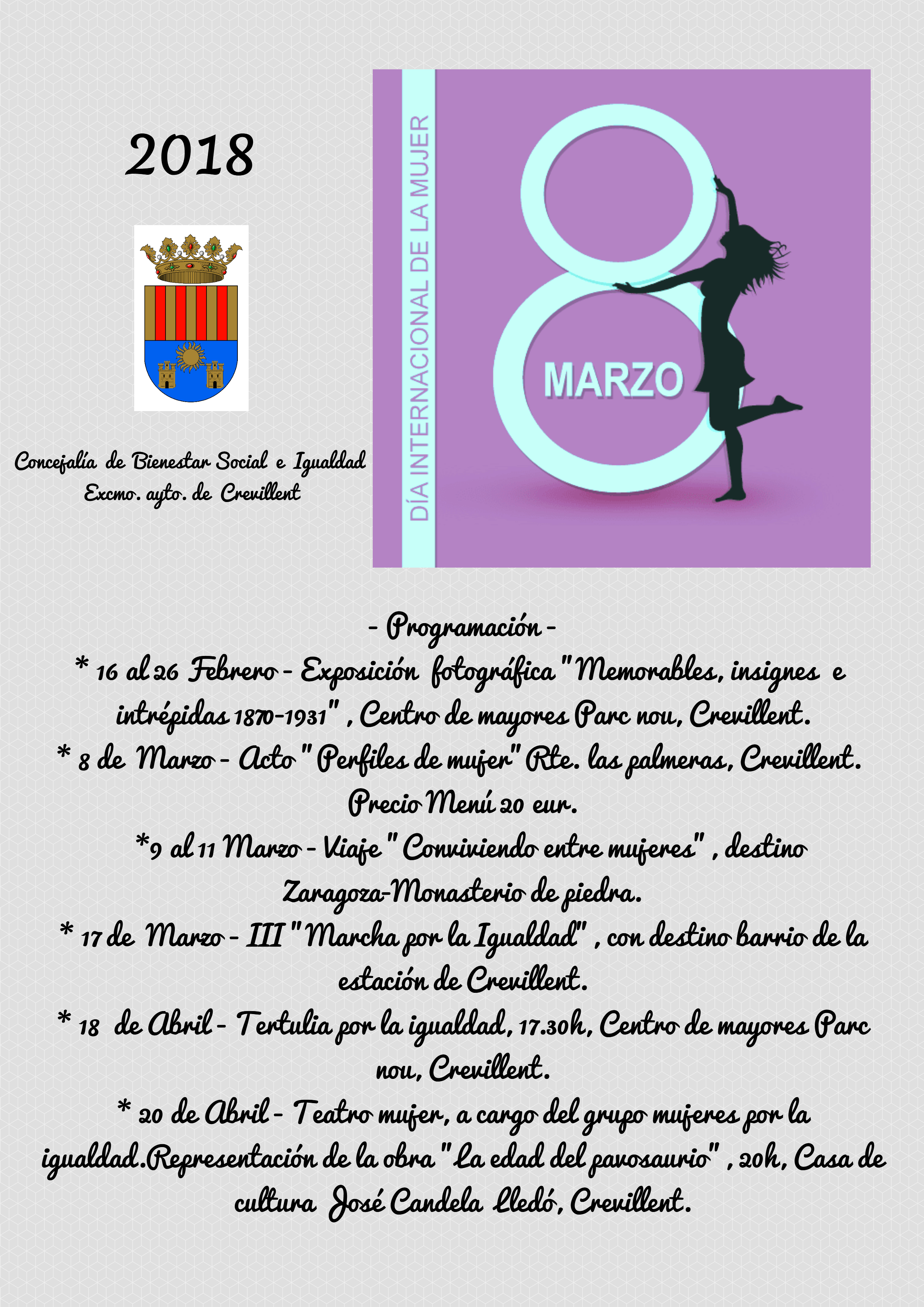 Crevillent ( 16/02/2018).- La Concejalía de Bienestar Social e Igualdad del Excmo. Ayuntamiento de Crevillent ha organizado una variada programación para ensalzar y celebrar el día 8 de marzo, Día Internacional de la Mujer.