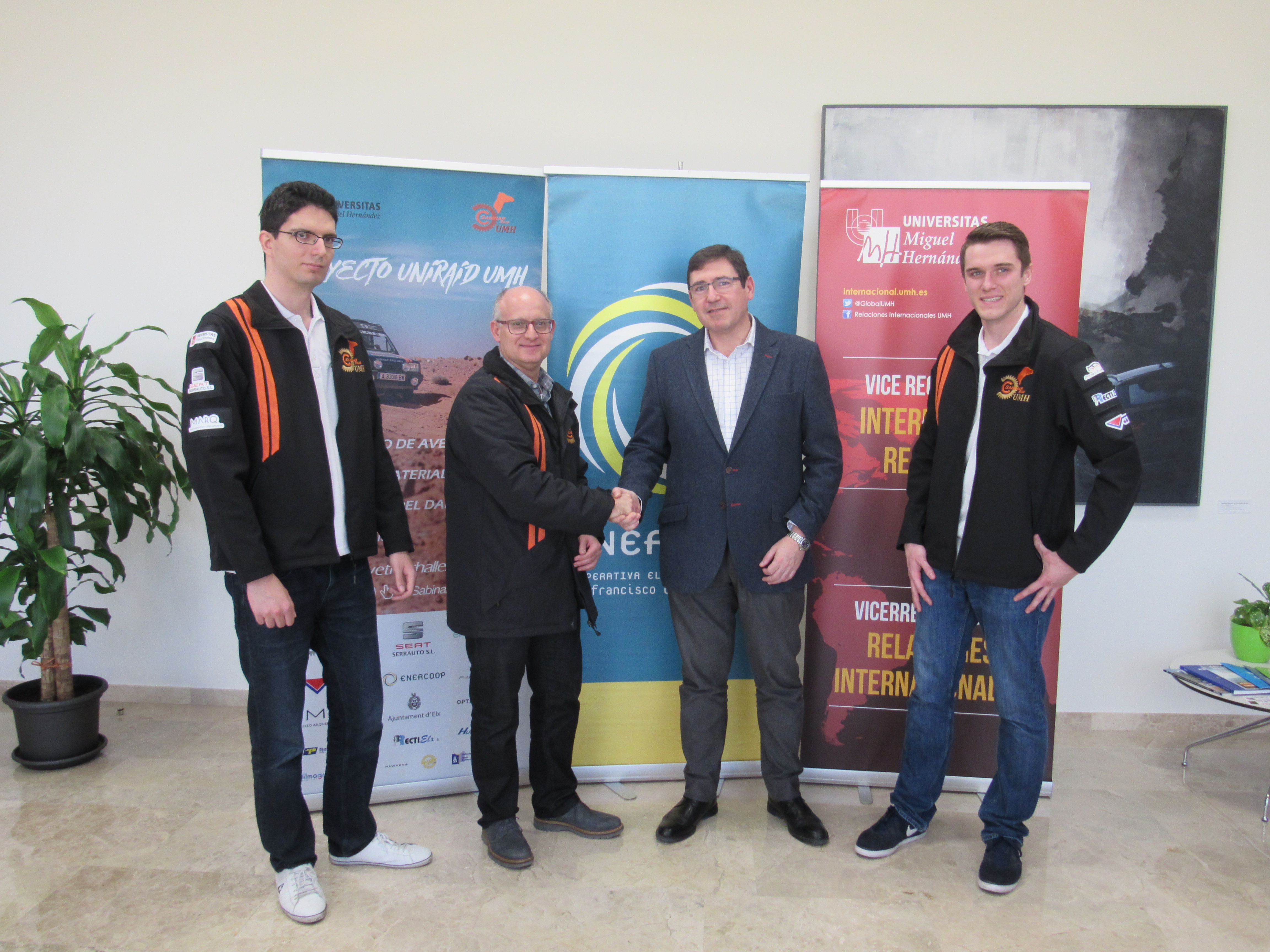Ingeniería Industrial, y Antonio Alcaina (piloto) y Thomas Potton (copiloto), del Grado en Ingeniería Mecánica de la UMH. Dos de ellos participaban ayer en la firma del convenio de colaboración, sellado entre el vicerrector de Relaciones Internacionales, Vicente Micol, y el presidente del Grupo Enercoop, Guillermo Belso.