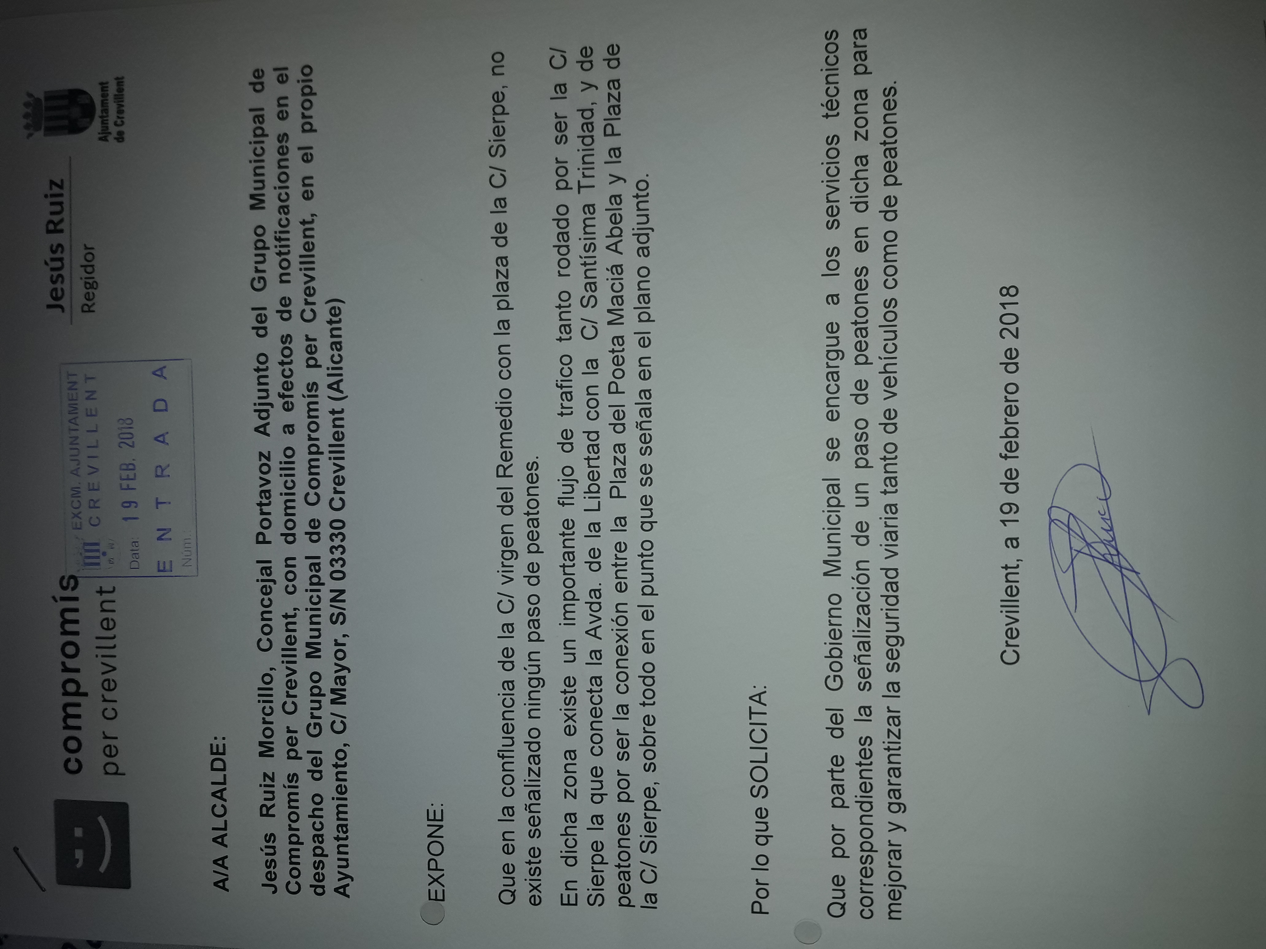 Documento acreditativo de solicitud de un paso de peatones la confluencia de la Plaza del Poeta Maciá Abela a la plaza de la C/ Sierpe