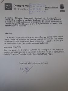 El Grup Municipal de Compromís ha registrat un escrit en el qual demana que es restituïsquen els bancs que es van retirar en la C/ Verge del Remei al costat de la Parròquia de la Santíssima Trinitat.