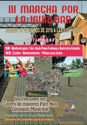Crevillent ( 01/03/2018).- La “III Marcha por la Igualdad”, organizada por el Ayuntamiento de Crevillent y la Concejalía de Igualdad, se celebrará el próximo 17 de marzo con salida a las 9:00 horas desde el Paseo Fontenay y regreso en autobús sobre las 12:00-12:30 horas desde el Barrio de la Estación. Los participantes podrán recoger un obsequio ofrecido por la Concejalía y disfrutar de distintas actividades a su llegada a la Estación.