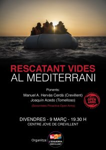 Este divendres dia 9 de març a les 19.30 hores al Centre Jove de Crevillent tindrà lloc la conferència «Rescatant vides al Mediterrani». La xarrada serà impartida per dos socorristes de la ONG «Proactiva Open Arms». Esta ONG es va convertir en mediàtica de manera recent pel reportatge del programa Salvados de La Sexta «Astral» on es contava la vida al vaixell que utilitza l’organització per fer els rescats en alta mar.