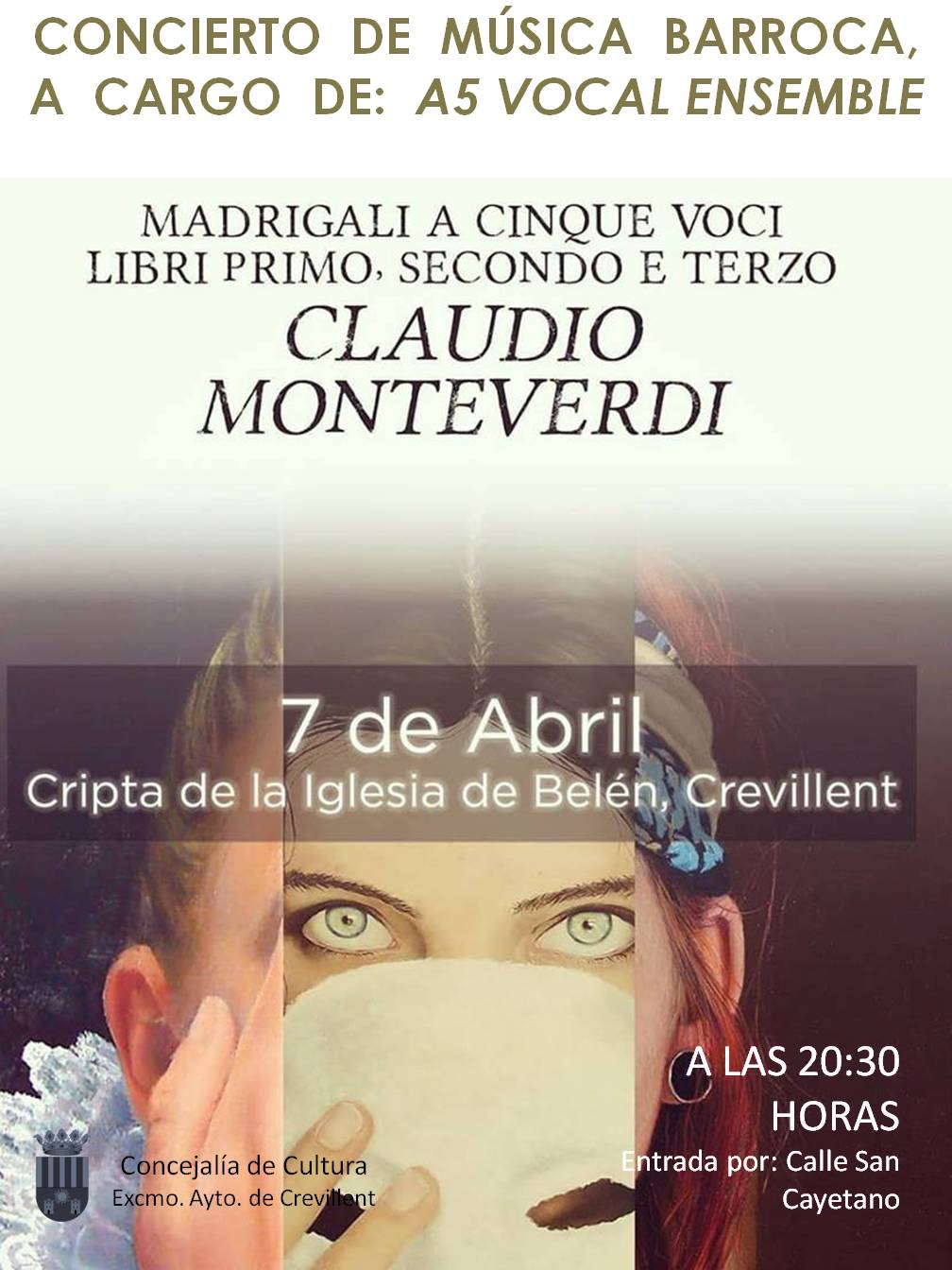 Se trata de un concierto de madrigales seleccionados de los tres primeros libros de Claudio Monteverdi, uno de los más grandes compositores de la Historia de la Música, aunque desconocido para el público en general. Nacido en Cremona en el año1567, es considerado el padre de la ópera, el innovador del “Ballo”, el renovador del madrigal que también se atrevió a buscar nuevas fórmulas en la música religiosa. Es además uno de los padres del barroco musical, la figura más importante en la transición entre la música del Renacimiento y del Barroco.