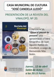 Crevillent ( 11/04/2018).- La presentación de la Revista del Vinalopó nº 20 tendrá lugar en Crevillent el próximo jueves, 12 de abril, a las 20:00 h en el salón de actos de la Casa de Cultura “José Candela Lledó”. Presentación que irá acompañada de una conferencia ofrecida por Bienvenido Mas Belén sobre la obra fotográfica del crevillentino Juan Agustín Ramos.