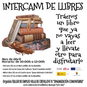 Crevillent ( 18/04/2018).- Entre los días 20 y 27 de abril los alumnos de Dinamización Comunitaria del Taller de Empleo “Villa de Crevillent IV” se situarán en diferentes lugares de la localidad para facilitar el “Intercambio de libros/Intercanvi de llibres”.