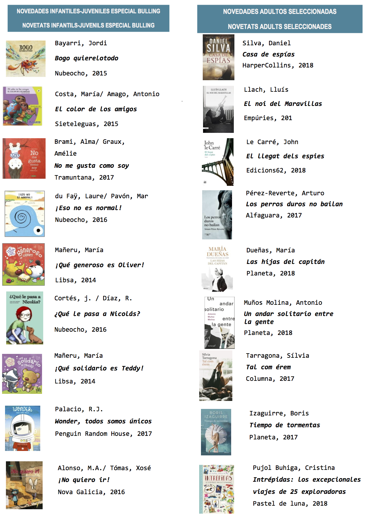Las novedades infantiles y juveniles tienen una especial dedicación al Bulling. Como ejemplos “Wonder, todos somos únicos” de R.J. Palacio, “¿Qué le pasa a Nicolás?” de Cortés y Díaz, “No me gusta como soy” de Alma Brami y Amélie Graux o “No quiero ir” de M. A. Alonso y Xosé Tómas.