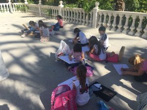 Los niños pintarán en acrílico al tratarse de una pintura húmeda que seca rápido. Sus dibujos tendrán relación con el paisaje, sacando provecho de la luz natural, y podrán centrarse en aquello que más les llame la atención ya sea una flor, una composición vegetal o un detalle arquitectónico.
