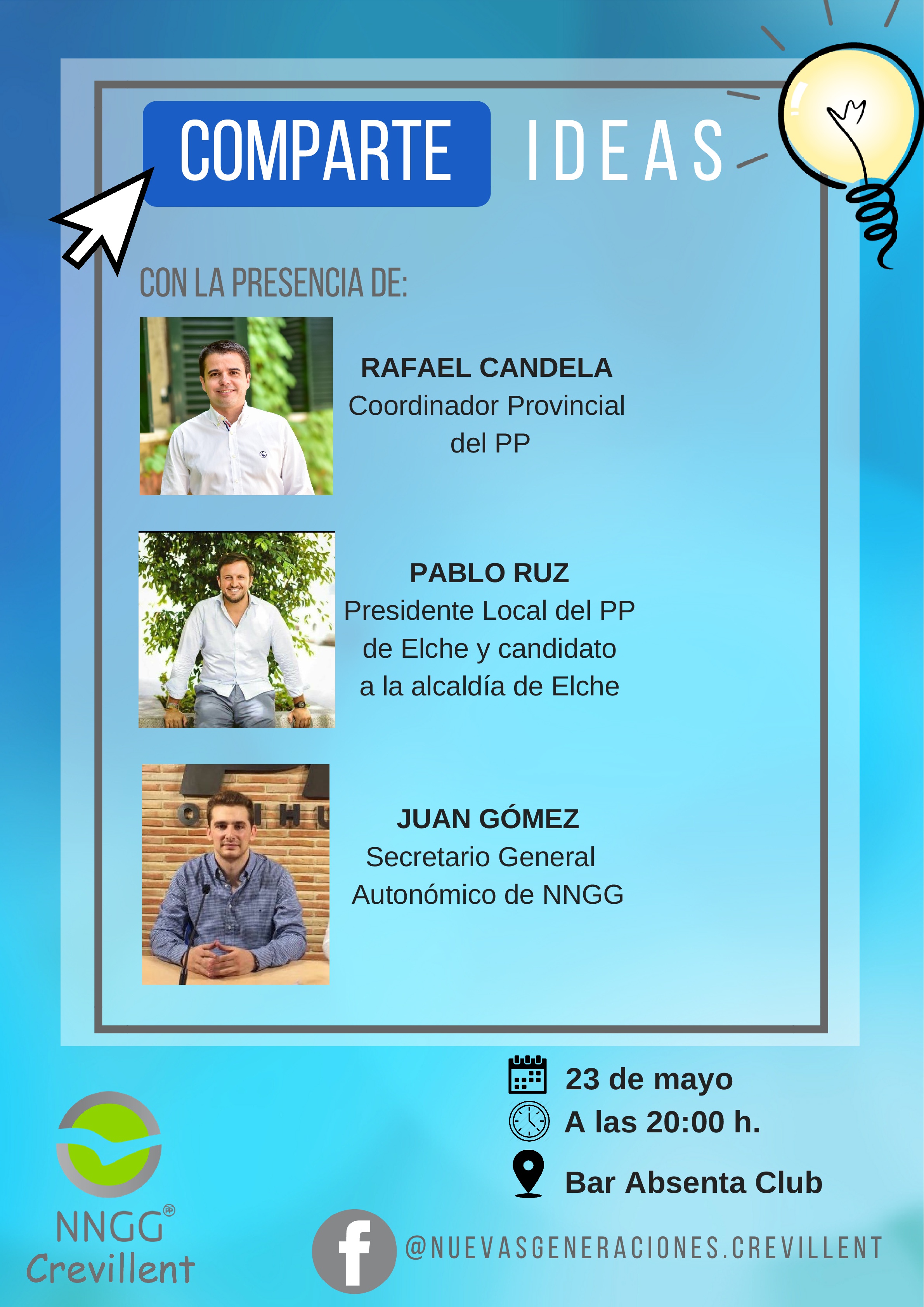 En el acto nos acompañarán Rafael Candela, Concejal de Juventud en el Ayuntamiento de Crevillent y coordinador provincial del Partido Popular, Pablo Ruz, Presidente del PP de Elche y candidato a la alcaldía, y Juan Gómez, el recién nombrado Secretario General de NNGG de la Comunidad Valenciana.
