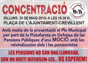 La Plataforma en Defensa de les Pensions Públiques de Crevillent ha presentat una moció en el Ple del mes de maig a través dels Grups Municipals de L’Esquerra i Compromís, perquè es restablisquen els drets dels pensionistes.