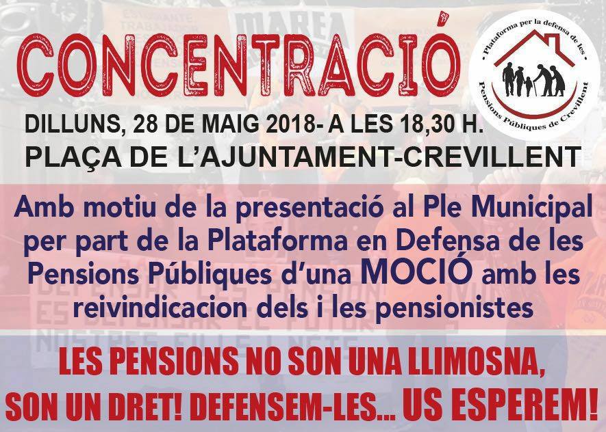 Per açò, des de la Plataforma en Defensa de les Pensions Públiques de Crevillent, volem convidar a tota la ciutadania de Crevillent a la concentració per a donar el seu suport a aquesta reivindicació, per als actuals i futurs pensionistes.