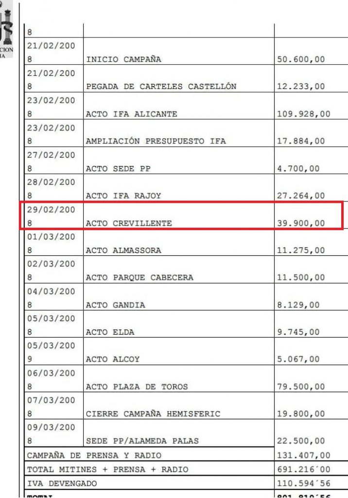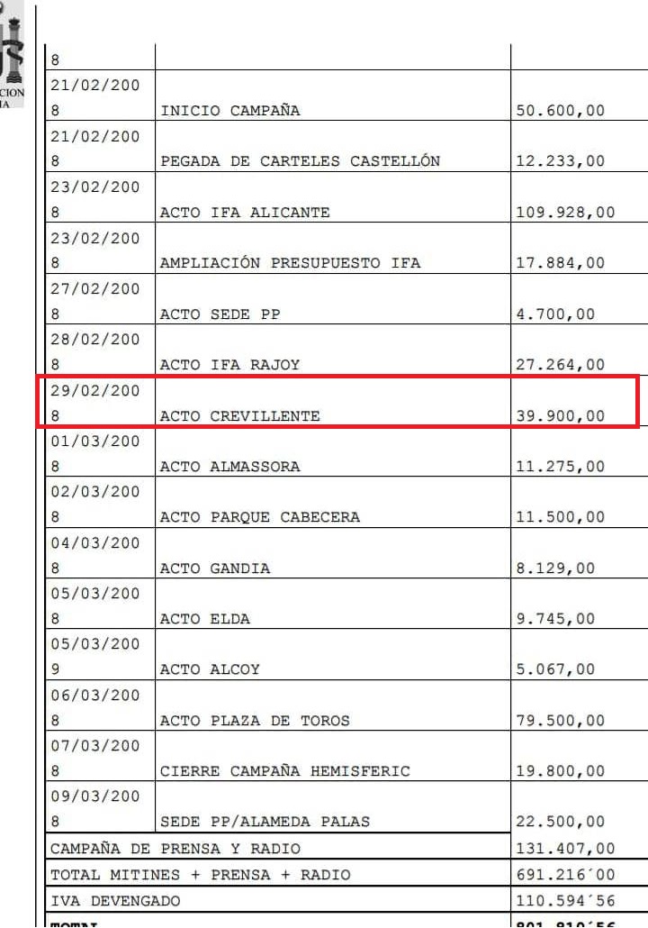 Este lunes se ha dado a conocer el resultado del juicio a exmiembros del Partido Popular en la Comunidad Valenciana quedando demostrado el desvío de fondos y la malversación con la que el partido actuó y que ha reportado sendas condenas a varios de sus dirigentes. Entre los actos que la trama Gürtel utilizó para esta financiación ilegal se encuentra un acto realizado en Crevillent por un valor de 39.900 euros. Una cifra poco desdeñable si la comparamos con el dinero desviado en otras ciudades. Según la sentencia el acto en Crevillent supuso un gasto más elevado que los actos de Gandía, Elda y Alcoi juntos todos ellos.