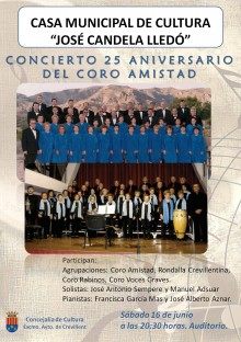 Crevillent ( 14/06/18).- El próximo sábado 16 de junio, a las 20:30 horas, tendrá lugar el “Concierto 25 aniversario del Coro Amistad” en el Auditorio Municipal de Crevillent; se trata de un músico-cultural que contará con la colaboración de numerosos artistas y finalizará con un número final que no desean revelar.