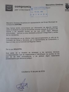 Según Marcelino Giménez, representante de Compromís en la Comisión de Obras, el pasado día 10, se pidió de nuevo que por parte del Gobierno del PP se tomaran medidas al respecto, la respuesta del Concejal de Obras, Manuel Moya, fue tirar balones fuera eludiendo su responsabilidad y pedir a Compromís que haga el trabajo de los servicios municipales y que realice la inspección y diga en qué puntos concretos se tendría que actuar.