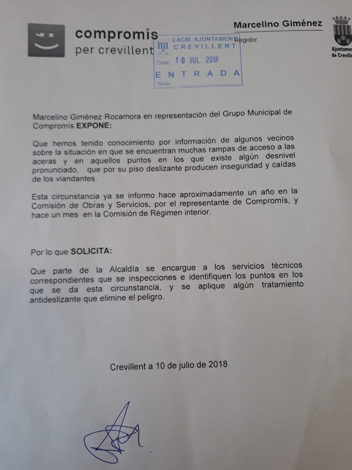Crevillent a 17 de juliol, el Grup Municipal de Compromís per Crevillent mostra la seua preocupació per la inactivitat i despreocupació del govern del PP en la situació en què es troben moltes rampes d’accés a les voreres, que pel seu pis esvarós produeixen inseguretat i caigudes dels vianants.