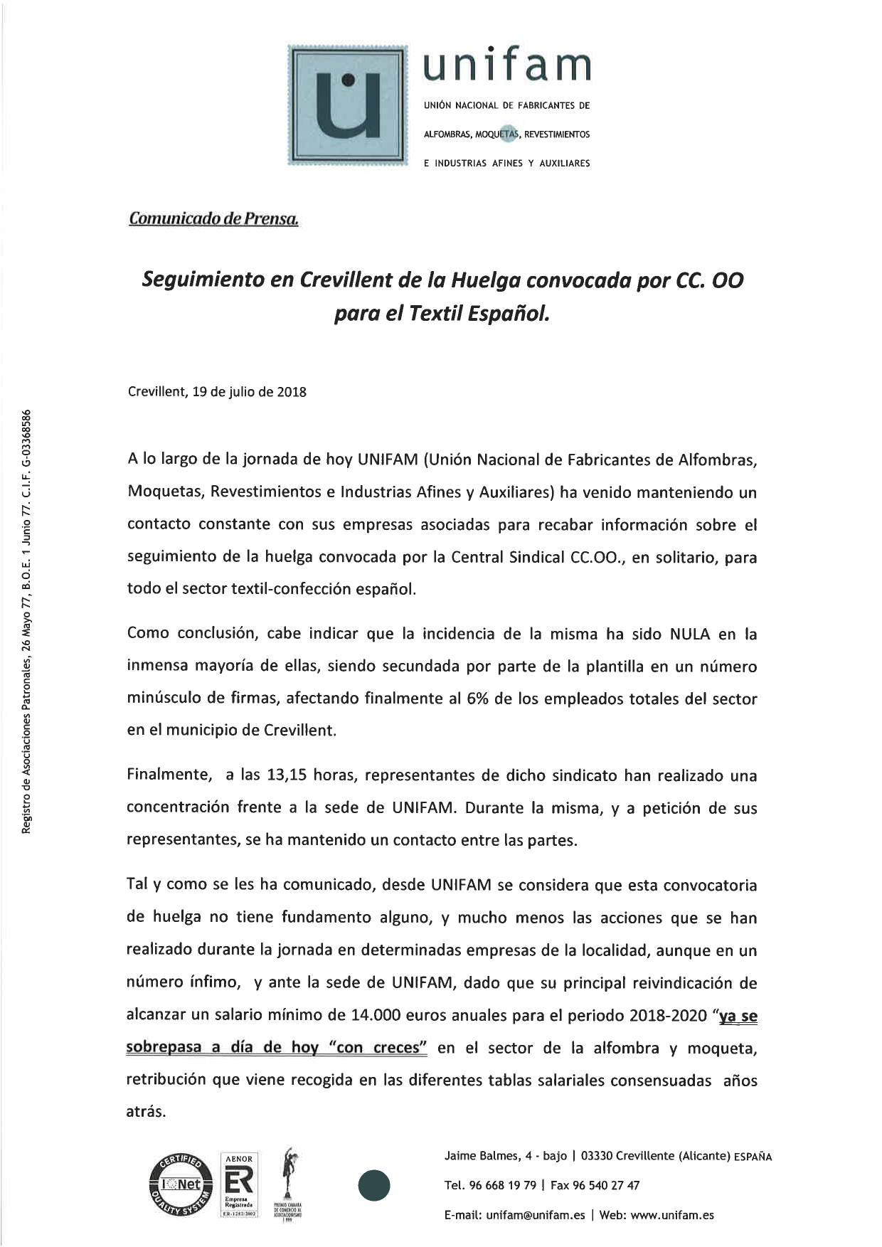 UNIFAM considera que esta convocatoria de huelga no tenía ningún fundamento ya que la principal reivindicación de alcanzar un salario mínimo de 14.000€ anuales para el periodo 2018-2020 «ya se sobrepasa a día de hoy con creces en el sector de la alfombra y moqueta, retribución que viene recogida en las diferentes tablas salariales consensuadas años atrás»