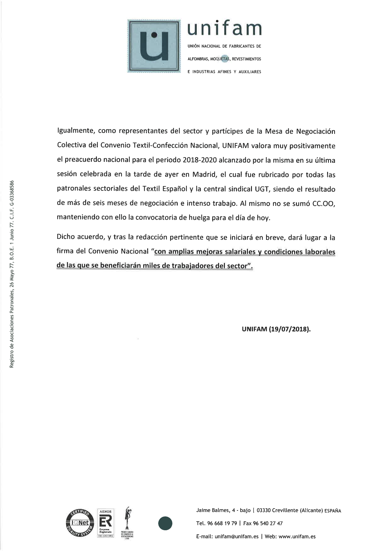 Por otro lado, UNIFAM valora muy positivamente el preacuerdo nacional para el periodo 2018-2020 alcanzado, en su última sesión, por la Mesa de Negociación Colectiva del Convenio Textil-Confección Nacional, de la que UNIFAM es representante del sector y partícipe, y que fue ribricado por todas las patronales sectoriales del Textil Español y la central sindical UGT, acuerdo que se alcanzó tras más de seis meses de negociación e intenso trabajo. Recordemos que CCOO se desvinculó del acuerdo, convocando la huelga de hoy.