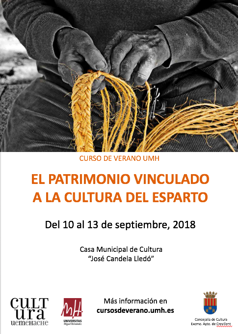 Crevillent (05/09/2018).- La Casa Municipal de Cultura “José Candela Lledó” acoge del 10 al 13 de septiembre el curso de verano de la Universidad Miguel Hernández “El patrimonio vinculado a la cultura del esparto”. El objetivo del curso es conocer la importancia y desarrollo de Crevillent y su entorno, así como aproximarse a todos los estudios que se han llevado a cabo y se están realizando, sobre estos ámbitos.